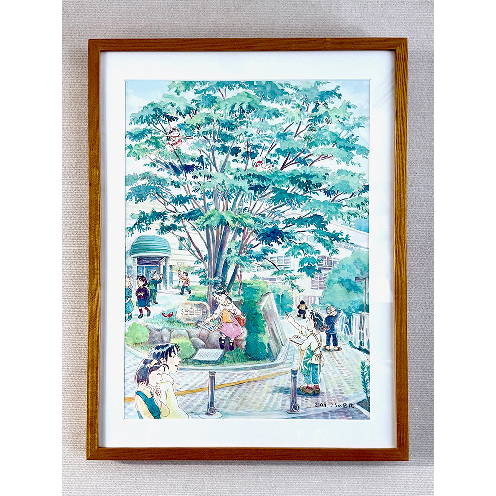 こちらの絵は、マンガ家・こうの史代さんへ個人的に依頼して2021年に描いていただいた「自由の学び舎」というタイトルの水彩画で、うちの大学の理念を象徴するような作品です。実際に大学内の風景を描いてもらっているのですが、『夕凪の街』(2003年)や『この世界の片隅に』(2007~2009年)など、こうのさんの作品の登場人物たちが、もしもあの戦争がなかったら、大学で好きなことを自由に学んでいたら……という理想郷のような場所として描かれています。