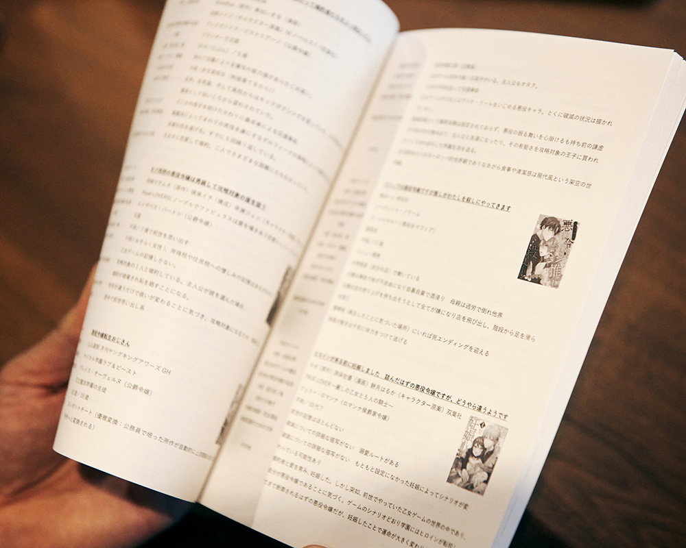 きりとり 私は「悪役令嬢もの」のコミカライズやマンガや縦スクロールのウェブトゥーンの作品を追っていて、これらの形式の作品だけでもすでに900タイトル以上です。日本と韓国で特に多くつくられていて、小説を原作にマンガ化・ウェブトゥーン化されるケースがほとんどです。アニメ化作品も現在10作を超えてきました1。すべてを網羅するのは難しいのですが、このジャンルの一端をまとめようと、私は今日座談会に参加してもらっている方も含むメンバーで『悪役令嬢百科:乙女ゲーム転生【初版】』(パンのパン、2025年)というデータベース的な冊子も制作しました。