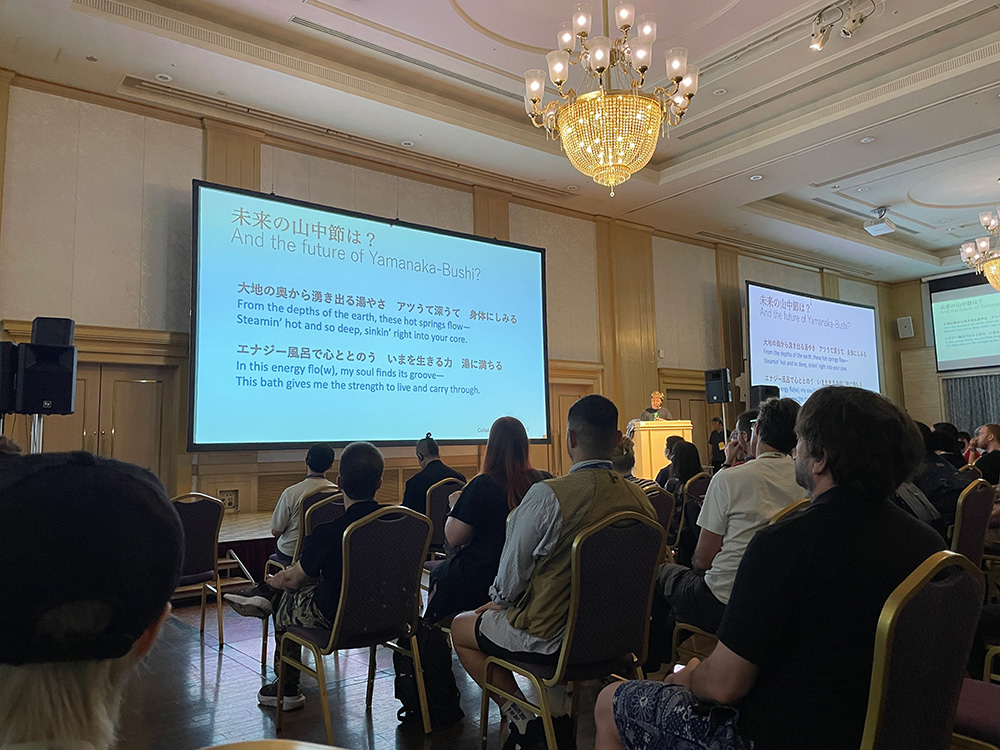 加賀市にまつわるコミュニティ・アーカイブに取り組むアーキビスト/キュレーターの明貫紘子氏は、メインプログラムの一つに登壇し、加賀温泉郷の一つ、山中温泉に伝わる伝統芸能、民謡「山中節」の歌詞に着目したレクチャーを実施した。山中節はその昔、日本海を南北につないだ交易船「北前船」が北海道からもたらしたものであることや、その歌詞が現代に至るまで新たにつくられ続けていることなどを紹介。伝統ある民謡が持つストーリーとクリエイティビティを参加者に伝えることで、THUのテーマと加賀市をつなぐ役割を担った。「レクチャー後に海外からの参加クリエイターと話し、ローカルな話題でも世界へ伝わるという手応えを感じました。私も含めて、加賀市民にとっては地元の伝統文化に込められた歴史観や世界観の再発見につながったと思います。歌詞の英訳プロセスは山中節を多面的に解釈する機会となり、どのように後世へ創造的に伝えていくか、考えるきっかけにもなりました」と明貫氏。