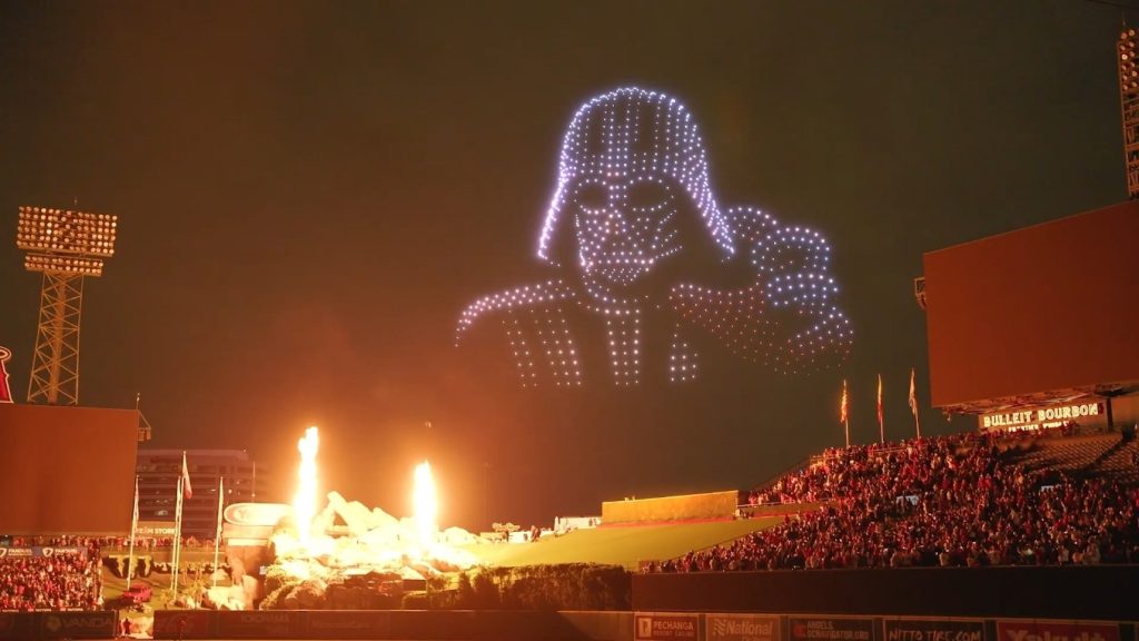 しかしながら、未来もそうであるとは限りません。今日、スペクセルズが提示した考えは広く普及しており、ドローン・ショーにはさまざまな企業が参入しています。当初は簡単な図形を表示できるのみでしたが、より複雑な図像も表現できるようになっており、地上の音響効果とともに映画の場面を再現したものなどが存在します。また、一度のショーで1,000機以上のドローンが用いられることも増えています11。