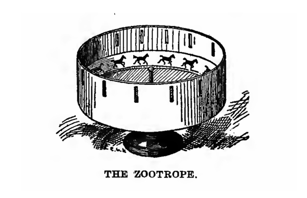 映画誕生以前に生まれたフェナキストスコープ、ゾートロープ(図1)といった19世紀の光学機器/玩具もまた、アニメーションと見なされることがあります。これらは少しずつ図柄の異なる像が描かれた装置を回転させ、装置に設けられたスリットからそれを覗くと、あたかも像が動いているように見えるものでした。原理的には上述したアニメーション映像と同じものです。