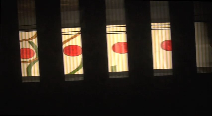 現代でも、こうした現象を利用した作品が制作されることがあります。1980年に制作されたビル・ブランドの作品《マストランジスコープ》(Masstransiscope)は、ニューヨーク地下鉄のトンネルの壁に約91m幅の絵を描いたもので、これに蛍光灯で照明が当てられています。絵とレールの間にはスリットが設けられており、乗客が列車でこのトンネルを通過すると、車窓からは描かれた絵が動いて見えます(図2)。装置を回転させるのではなく、観客の方が動くことでゾートロープと同様の動きの錯覚を起こしているのです。