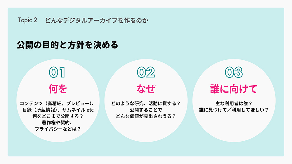これに対し、分類にただ一つの正解はなく、目的に合わせてすでにある一般的な分類をできる限り活用しつつ、独自の項目はデータ作成者以外が理解しやすい内容・形式で記述するのが重要だと回答されました。また、簡潔な構造にすることや、必須項目と任意項目の整理も欠かせないとも。権利の表記については、ウェブサイトのフッターなどにライセンスポリシーをはっきりと示し、引用部分は例外であると注記する手法や、作品の著作権状態を示す「ライツステートメント」を記載することが提案されました。特に権利者がわからない場合、文化庁の裁定制度を活用したり、関係者へ確認したりすることが現実的な対応となります。作家本人が掲載された資料については、情報が切り取られてもわかるよう、個人名での記述が望ましいと提案されました。