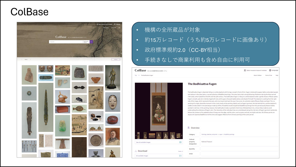 アーカイブの活用の面では、データを無償で公開することの戦略的な意義が話されました。一例として挙げられたのが国立文化財機構の「ColBase」。本データベースでは、画像を無償で提供することでメディアや教育現場で活用される機会が大幅に増え、認知度が上がり、結果として文化財や東京国立博物館の知名度アップにつながったといいます。