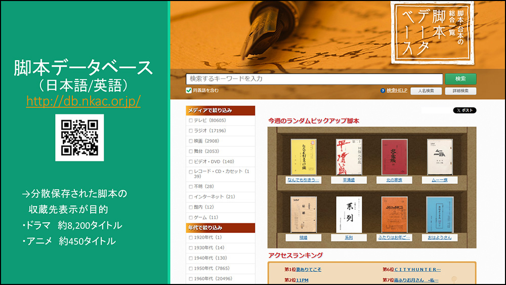 また各地に分けて保存された脚本は、構築した「脚本データベース」と「アニメ脚本と脚本家のデータベース」にて、検索ができるようにしています。脚本データベースには1日100名以上の新しい利用者がアクセスし、アニメ脚本と脚本家のデータベースは多くの海外の利用者もいます。