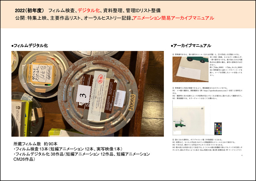 タクンボックスは、アニメーション作家、イラストレーター、絵本作家など多彩な活動を行う古川タク氏の作品アーカイブを軸として、準備期間も含め約10年かけてアーカイブ活動を進めてきました。その背景には、戦後日本の短編アニメーションを担った作家たちのフィルム・資料が失われつつあるという危機感があります。若い世代が中心となってアーカイブ化に取り組むなかで、本事業は最初のモデルケースと位置付けられています。